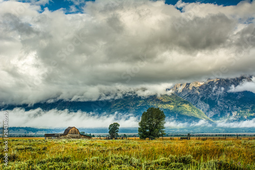 Obraz premium Barn in Expansive Field Below Dramatic Cloud-Covered Tetons - 2