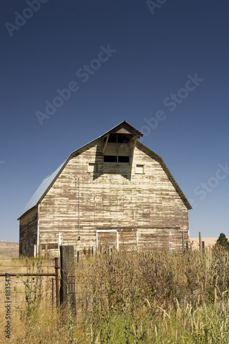 © JEANNE, Obraz premium Barn in the mist of a wheat field under a puffy cloud blue sky