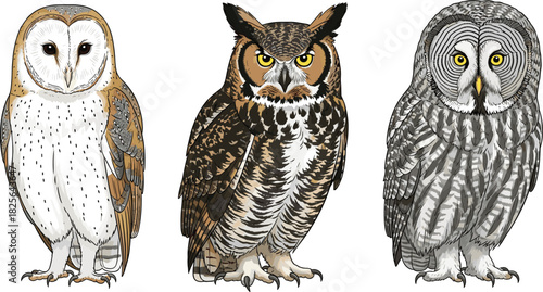 Naklejka premium Barn Owl, Great Horned Owl, Great Gray Owl, bird species, owl comparison,...