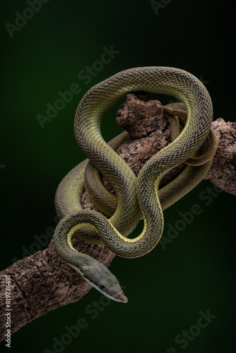 Obraz premium Baron Green Racer snake perched on a tree, against a dark backdrop