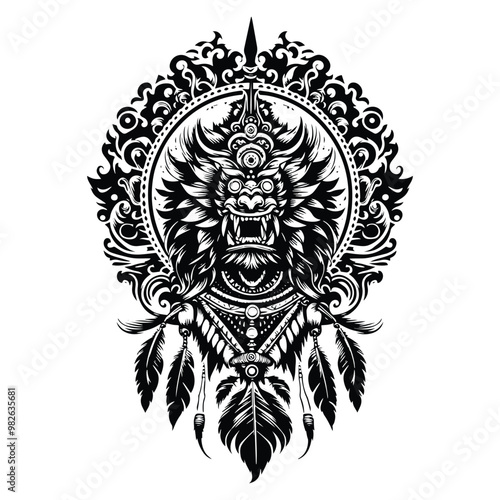 © Cici, Fototapeta premium Barong with bohemian decoration in black and white illustrations, cutout graphic h