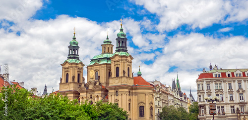 © Lyd Photography, Fototapeta premium Baroque church of St. Nicholas in Malá Strana quarter in the romantic Prague under blue sky. Panoramic of the old city of the hundred towers on a summer day in the capital of the Czech Republic.