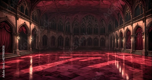 Obraz premium baroque room interior of gothic palace castle mansion with candles dark red embellishments. goth horror ballroom with arches, columns, and pillars.