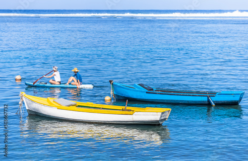 © Unclesam, Naklejka premium Barques de pêche et paddle assis au Bassin Pirogue, l’Etang-Salé, île de la Réunion
