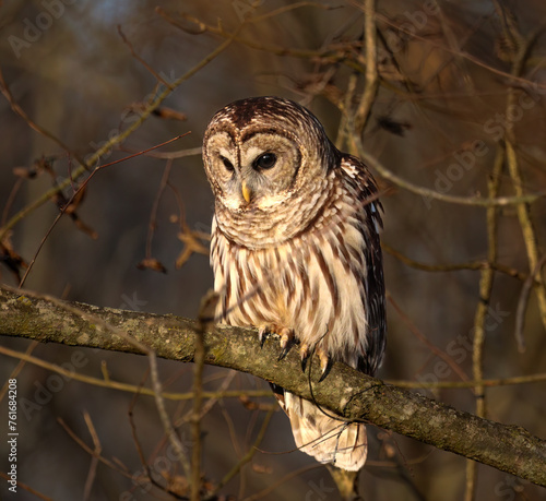 Obraz premium Barred Owl intently searching the forest floor for prey at dusk.