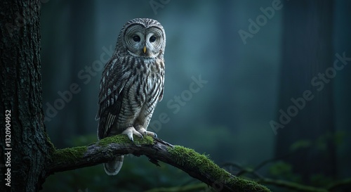 © Ayi, Fototapeta premium Barred Owl Perched Elegantly in Misty Forest