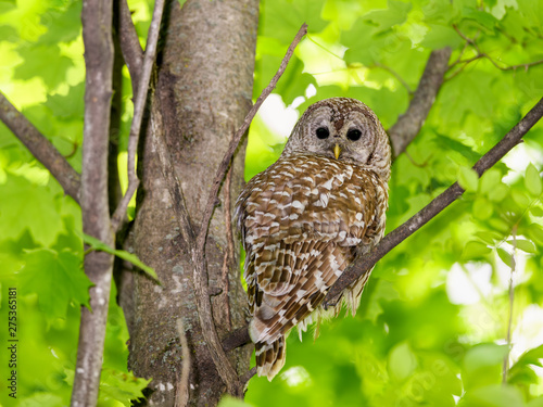 © FotoRequest, Fototapeta premium Barred Owl Sitting on Tree Branch on Green Background