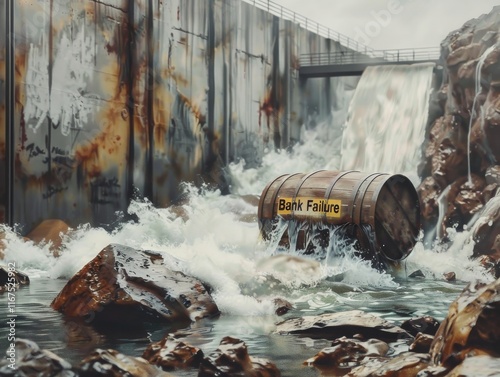 Fototapeta premium barrel labeled "Bank Failure" caught in a broken dam