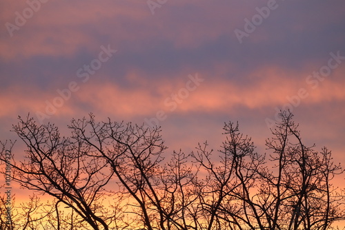 Obraz premium barren bleak winter trees against pink gray clouds at sunrise