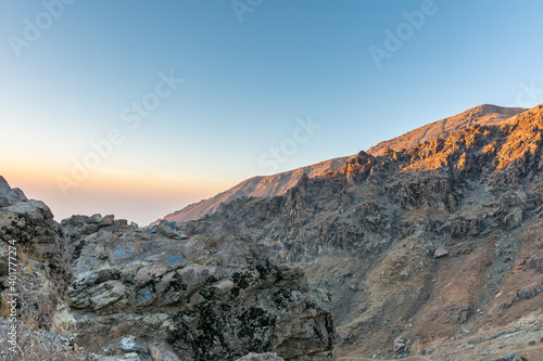 © zz3701, Fototapeta premium Barren mountain in Darband valley in dawn against colorful sky in the Tochal mountain with background of Tehran city in the morning. A popular recreational region for Tehran's residents