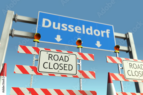 © Alexey Novikov, Fototapeta premium Barriers at Dusseldorf city traffic sign. Coronavirus disease quarantine or lockdown in Germany conceptual 3D rendering