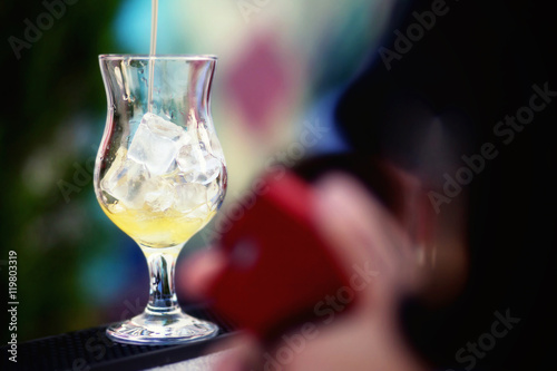 © ribalka yuli, Obraz premium Bartender preparing a cocktail with yellow syrup