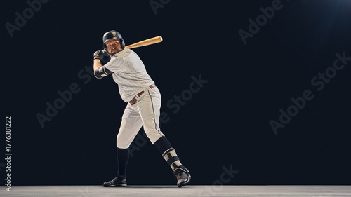 © Lustre Art Group , Fototapeta premium Baseball batter in ready stance focusing on pitch timing and reaction. Concept of anticipation and decision-making in game psychology, apparel advertising, and professional sports education.