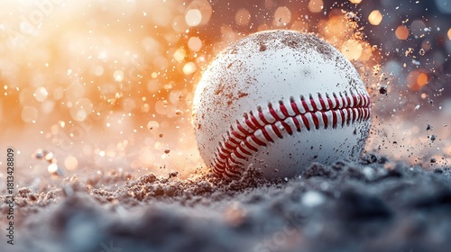 © Dece Std, Naklejka premium Baseball covered in dirt, red seams, bokeh lights shining behind
