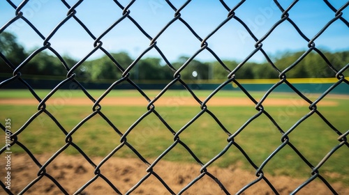 © Serhii, Fototapeta premium Baseball Fence. View of Game Field seen through Chain Link Grid with Dirt and Grass Infield