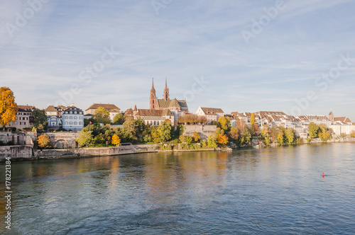 Naklejka premium Basel, Basel-Stadt, Altstadt, Stadt, Rhein, Rheinufer, Altstadthäuser, Münster, Pfalz, Fähre, Herbst, Herbstspaziergang, Grossbasel, Schweiz