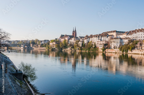 Naklejka premium Basel, Münster, Kirche, Pfalz, Rhein, Rheinufer, Stadt, Altstadt, Altstadthäuser, Grossbasel, Kleinbasel, Wettsteinbrücke, Frühling, Rheinschifffahrt, Fähre, Morgenstimmung, Schweiz