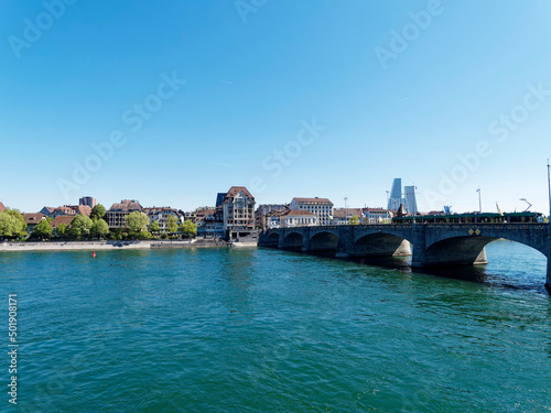 © Marc, Naklejka premium Basels Altstadt am Rhein in der Schweiz - Mittlere Brücke am Rhein mit Blick auf die Altstadt Kleinbasel und Unterer Rheinweg am rechten Ufer