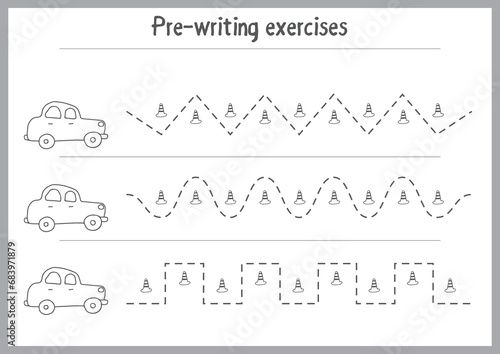 © saint_antonio, Naklejka premium Basic writing exercises. Trace line worksheets for children. Preschool handwriting practice. Vector illustration. A4 - ready to print format