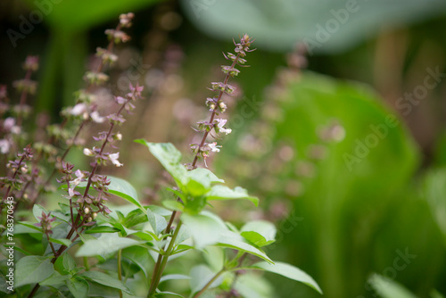 © Champ, Obraz premium Basil flowers in the garden, selective focus