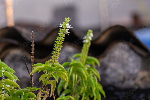 Naklejka premium Basil plant growing in the garden. Selective focus on the flower.