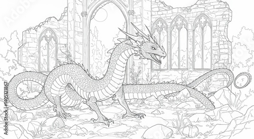 © Burak, Naklejka premium Basilisk Slithering Through Ruined Castle Line Art