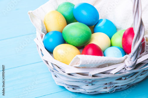 © Антон Скрипачев, Naklejka premium basket with colorful Easter eggs on a blue wooden background, selective focus, tinted image