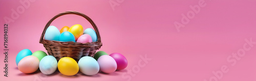 © Natalia, Naklejka premium Basket with easter eggs on pink background, banner, copy space. Easter Card