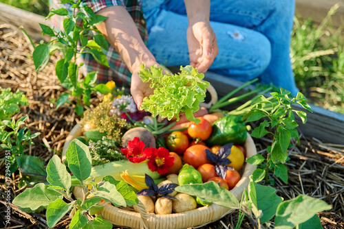 © Valerii Honcharuk, Fototapeta premium Basket with harvest of different fresh vegetables, female hands showing lettuce leaves