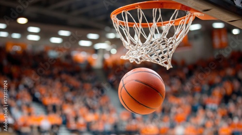 © Yevheniiya, Fototapeta premium Basketball about to go through the hoop during a game