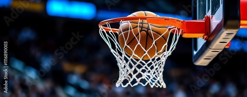 © k, Fototapeta premium basketball action close-up orange ball in red white net hoop indoor crowd