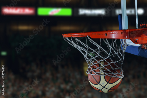 © .shock, Fototapeta premium basketball ball and net on black background