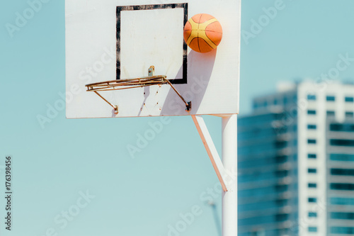 Obraz premium Basketball board with bouncing ball and office building in the background