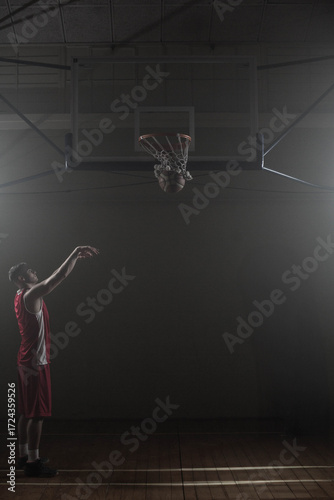 Fototapeta premium Basketball falling through net on wooden gym court under spotlights with deep shadows