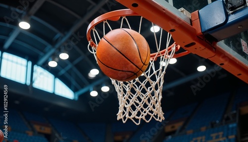 Fototapeta premium Basketball going through hoop in dramatic lighting against dark background