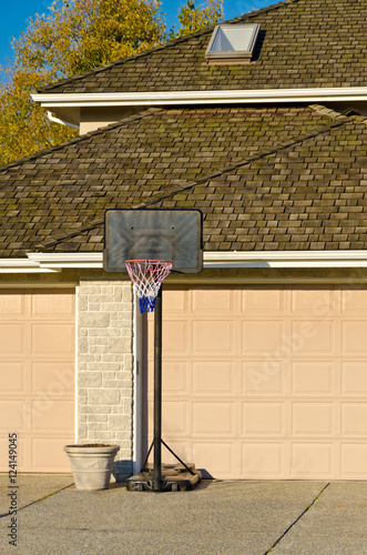 Naklejka premium Basketball Hoop in front of Triple Garage Doors on empty Suburban Residential Home Driveway
