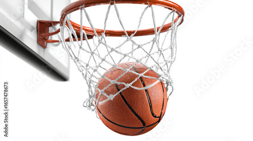 © Atchariya63, Fototapeta premium Basketball hoop net ball sport scoring orange competition recreation isolated excitement success closeup white background