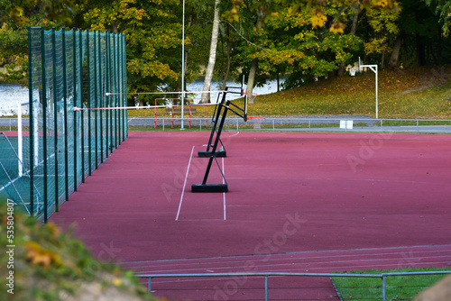 Fototapeta premium basketball hoop on a sports field on a sunny summer day on a red surface