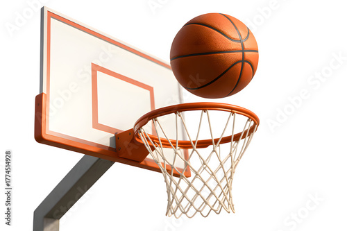 Fototapeta premium Basketball Hoop with Flying Ball – Dynamic 3D Mid-Shot Render on White