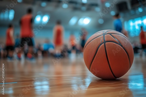 © Niken, Obraz premium Basketball on Court with Players Practicing in Background Training Concept