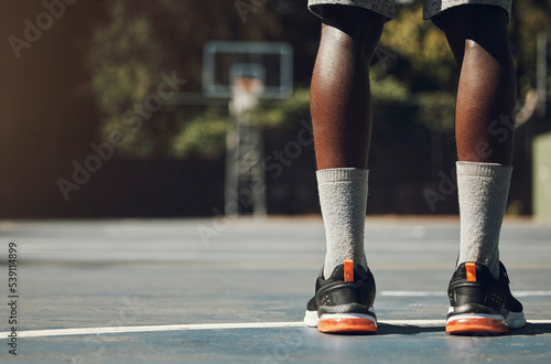 Fototapeta premium Basketball, sneakers and athlete black man standing on community sports court...