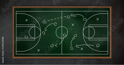Fototapeta premium Basketball strategy diagram with player positions and movements image on chalkboard
