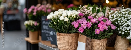 © lililia, Fototapeta premium Baskets filled with vibrant spring flowers sit on a table at a flower shop, showcasing nature's beauty in a lively setting