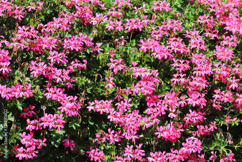 © Xato Lux, Naklejka premium Baskets of hanging petunia flowers on balcony. Petunia flower in ornamental plant. Violet balcony flowers in pots. Background from flowering natural plants. Multi-colored petals and inflorescences. Fl