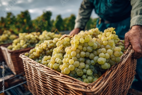 © Rostyslav, Obraz premium Baskets Overflowing with Harvested White Grapes Under Soft Blue Sky