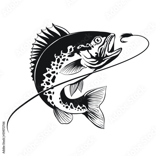 © pla2u, Naklejka premium Bass catch fishing lure line drawing style on white background. Design element for icon logo, label, emblem, sign, and brand mark.Vector illustration.