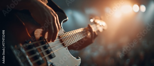 Obraz premium Bass Guitarist Performing Live Under Stage Lights, Close-Up View.
