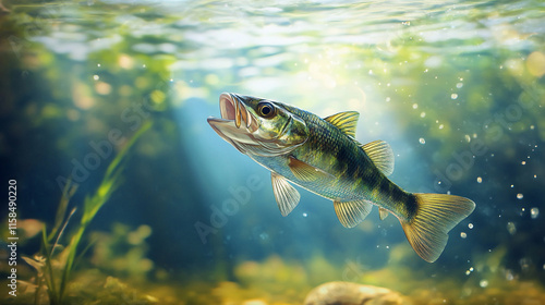 © Shahazadi, Fototapeta premium Bass swimming under the water in a serene lake during the afternoon light near the shore.