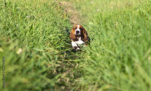 Obraz premium Basset hound puppy runs along the path in the green grass