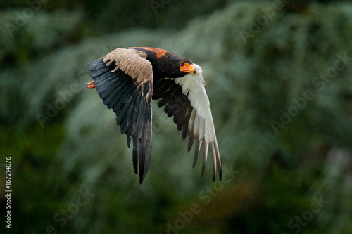 © ondrejprosicky, Fototapeta premium Bateleur Eagle, Terathopius ecaudatus, brown and black bird of prey fly in the nature habitat, Kenya, Africa. Wildlife scene form nature. Animal behaviour in forest. Rain in the forest and Bateleur